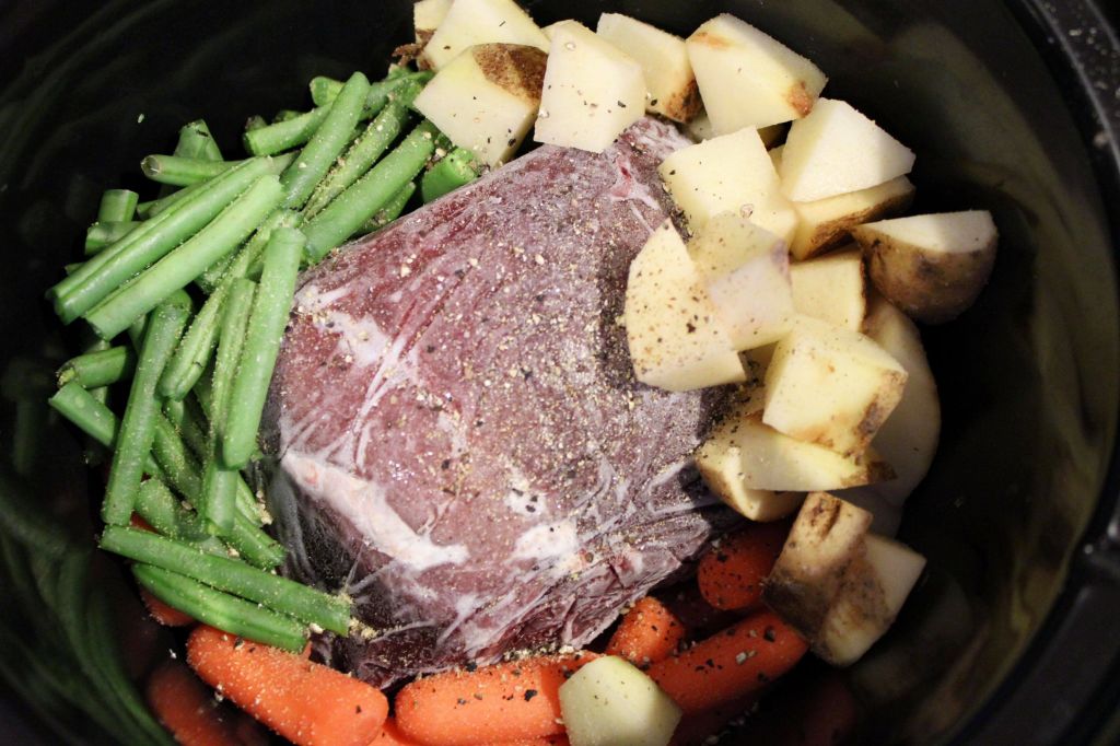 I know that you can just put your ingredients into the pot and go about your business, but if I am home and able, I like to make sure that all the veggies are pushed down and mostly covered by the gravy a couple hours into cooking just so that everything stays moist and flavorful.